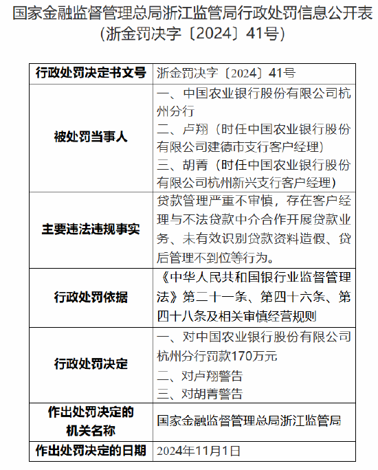 11月12日金融一线音书,国度金融监督处置总局浙江监管局行政处罚信息公开表知道,中国农业银行股份有限公司杭州分行因贷款处置严重不审慎,存在客户司理与犯法贷款中介勾通开展贷款业务、未有用识别贷款贵府作秀、贷后处置不到位等活动世博体育,被国度金融监督处置总局浙江监管局罚金170万元;卢翔(时任中国农业银行股份有限公司建德市支行客户司理)、胡菁(时任中国农业银行股份有限公司杭州新兴支行客户司理)二东说念主被监管申饬。
