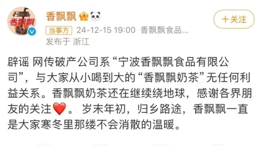 临了,在网友们稀里糊涂时,“正主”香飘飘发微博回话:网传停业公司系“宁波香飘飘食物有限公司”,与全球从小喝到大的“香飘飘奶茶”无任何利益商量。